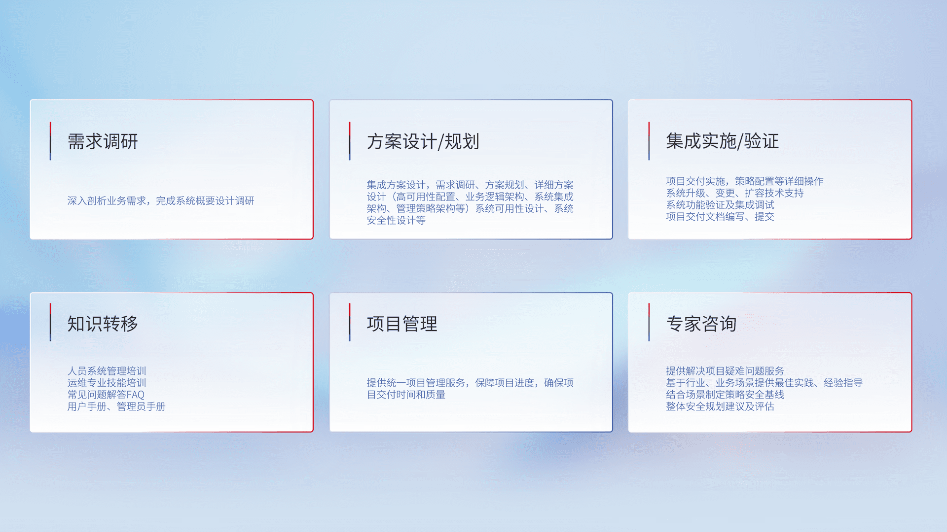 针对客户行业特性,,,,将宏观的安全战略和需求,,,,通过专业的交付服务,,,,实现项目落地,,,,为客户提供标准规范的集成交付服务。。