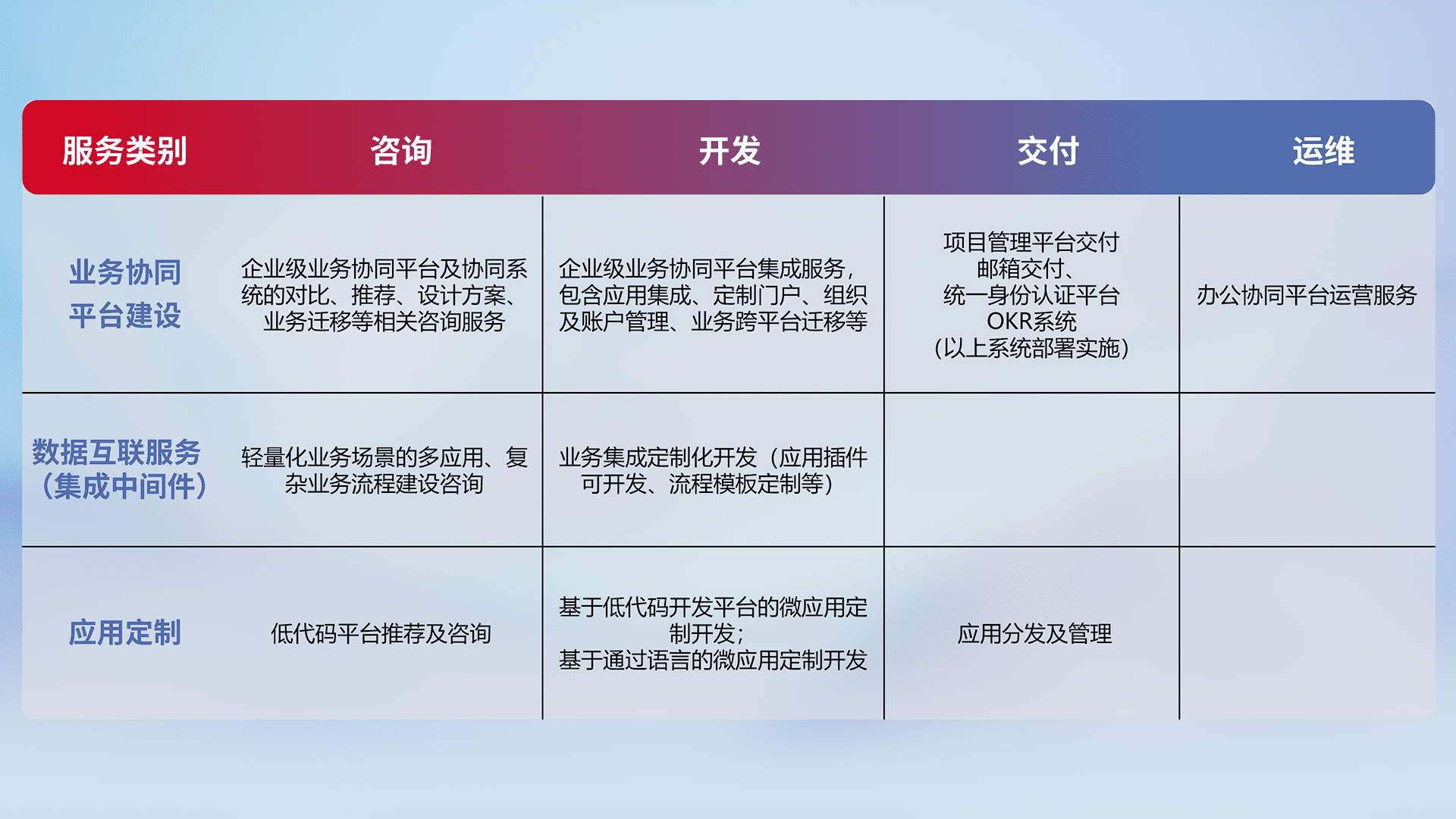 针对钉钉、、企微、、、、IDaas等平台级产品提供产品的规划、、、方案、、交付、、、定制化开发等服务,,实现如统一协同办公、、智能客户服务、、、、混合会议管理、、、、智能数据查询、、、、等业务场景,,,实现数字化转型。。